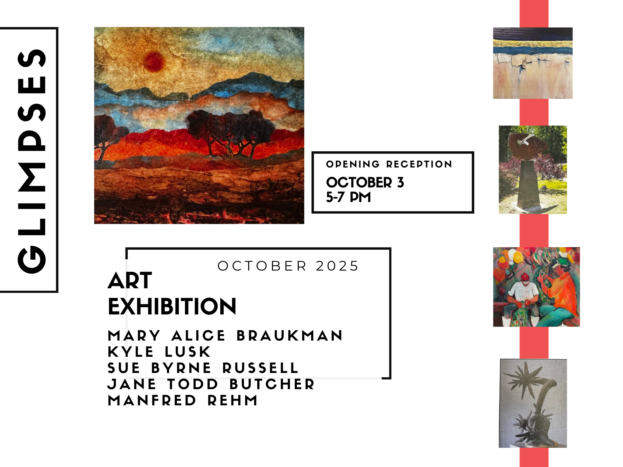 The exhibit will open in the Arts Council Gallery with an artist reception on Friday, October 3, 2025, 5-7pm (in conjunction with First Friday Gallery Walk). The public is invited to attend.